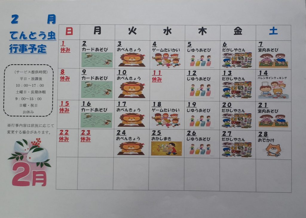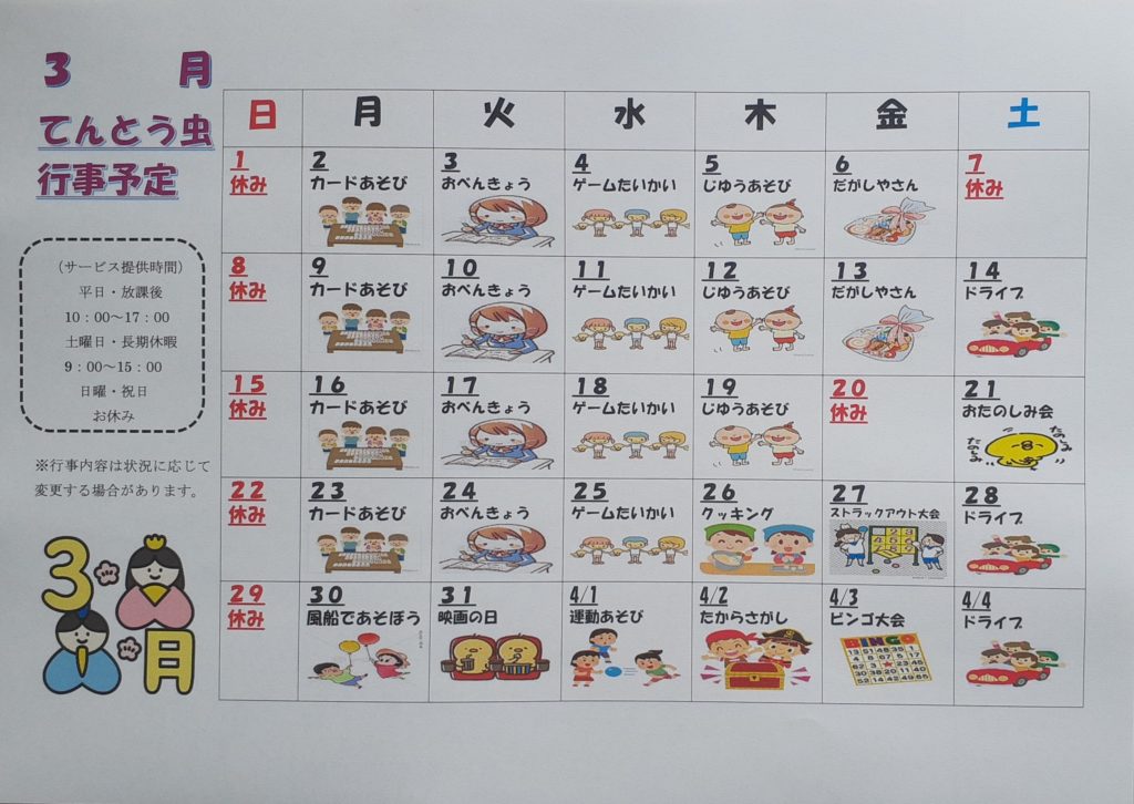 てんとう虫では毎日イベントを行っています。気になるイベントの日に体験での参加も可能です。ぜひお気軽にお問合せ下さい。