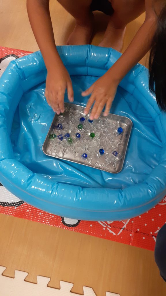 ゼリーの中にビー玉を入れキラキラに輝くのを見て「なにこれ?」と不思議そうに見つめ、触るとぷるんという感触で初めてゼリーだということに気付きわくわくした顔を見せてくれる子ども達☺