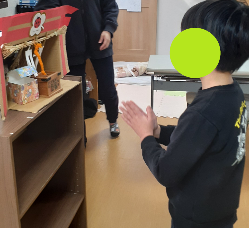 まず初めにみんなでジュースを選び「今年もよろしくお願いします。」と挨拶をして乾杯しました☺その後にはおもちを食べたり、神社に参拝しおみくじを引き今年の運だめしもしましたよ。子ども達にとって運は大切なようで「大吉だからゲームに勝てる!」と喜びを話してくれました★
